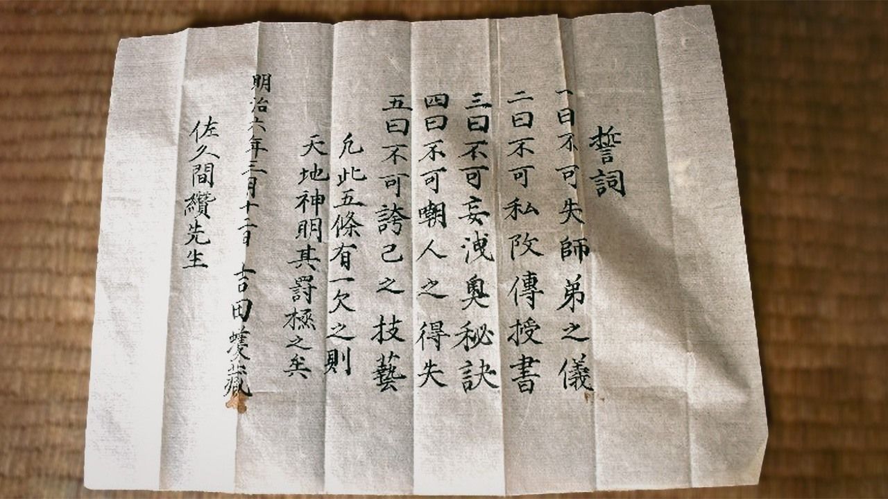 Фотография к заголовку: Договор о поступлении в школу васан, которой руководил Сакума Ёкэн. Текст содержит обязательства «не смеяться над неудачами других» и «не похваляться собственными умениями» (снимок сделан автором статьи)