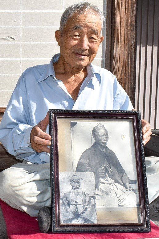 Портретные фотографии Сакумы Ёкэна (справа в молодости, слева на склоне лет) в руках Сакумы Мотому, потомка в четвертом поколении (снимок сделан автором статьи)