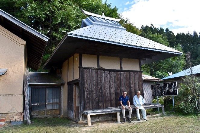 Накадзава Итио (слева) из Общества сохранения наследия Сакумы Ёкэна города Фунахики и Сакума Мотому, потомок Сакумы Ёкэна, перед зданием, служившим научным кабинетом Ёкэна. В прошлом к зданию примыкало общежитие для учащихся (снимок сделан автором статьи)
