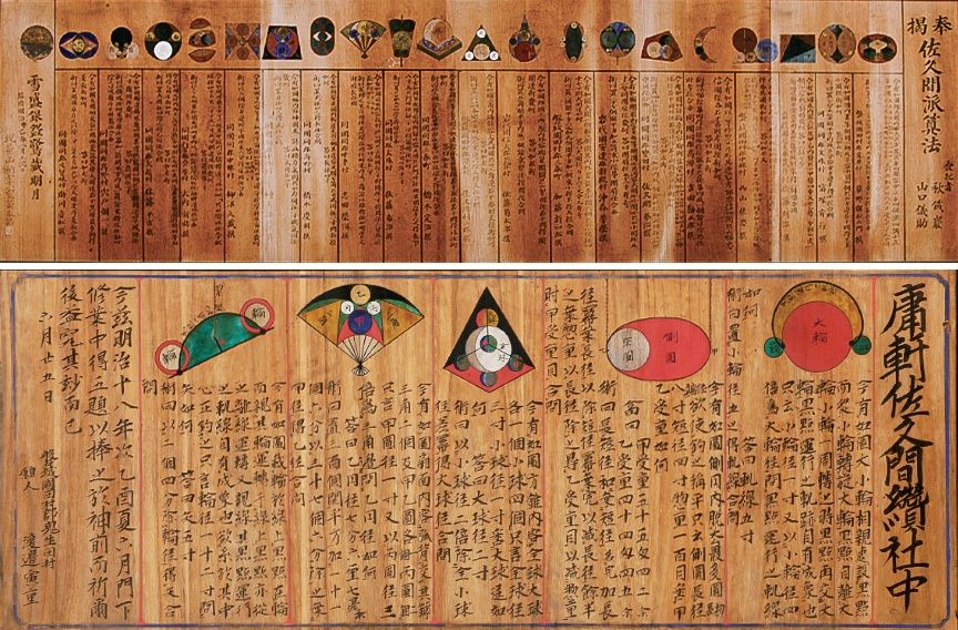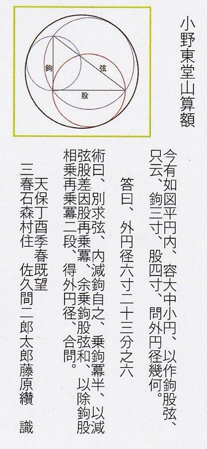 Задача в сангаку была следующей: в окружность вписаны три эллипса, длинные и короткие оси которых известны. Требовалось найти диаметр окружности. Другой математик васан опроверг предложенный ответ, но поскольку, по словам Фукагавы, в опровержении содержалась ошибка, еще один мастер васан разразился табличкой с критикой этих возражений. И тут ситуацию еще более запутало то, что была допущена ошибка в рисунке.