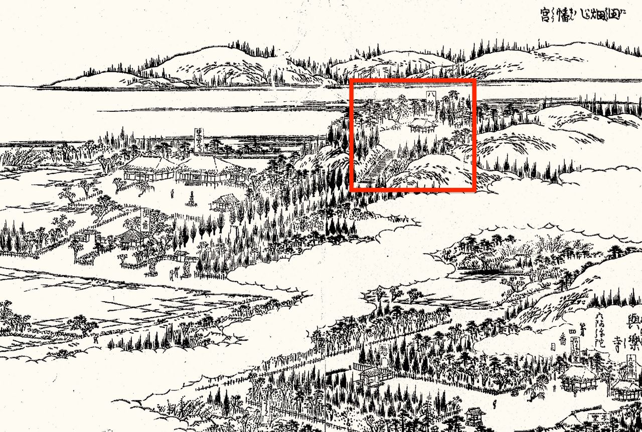 Святилище Табата Хатимангу в книге «Картины знаменитых мест Эдо» (Эдо мэйсё дзуэ, в красной рамке) (коллекция Национальной парламентской библиотеки)