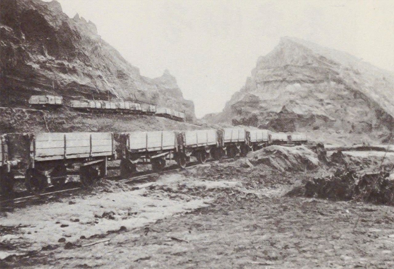 На этой фотографии показаны земляные работы по созданию уступов горной железной дороги («100-летняя история японских национальных железных дорог», коллекция Национальной парламентской библиотеки)