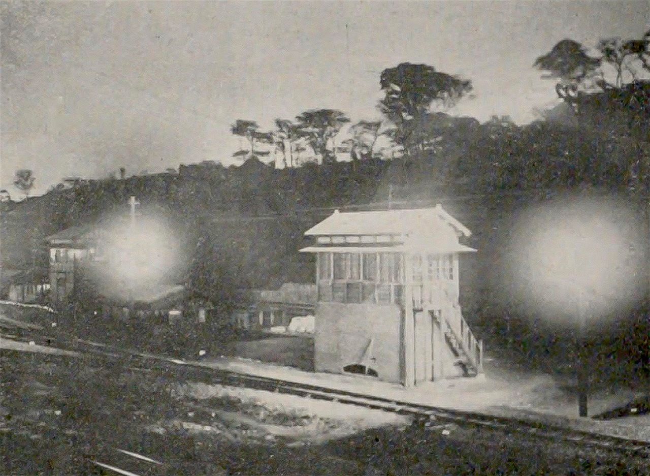 В годы Тайсё на грузовой площадке Табата были установлены прожекторы для освещения в ночное время (газета «Мацуда симпо», 1916 г., собрание Национальной парламентской библиотеки)