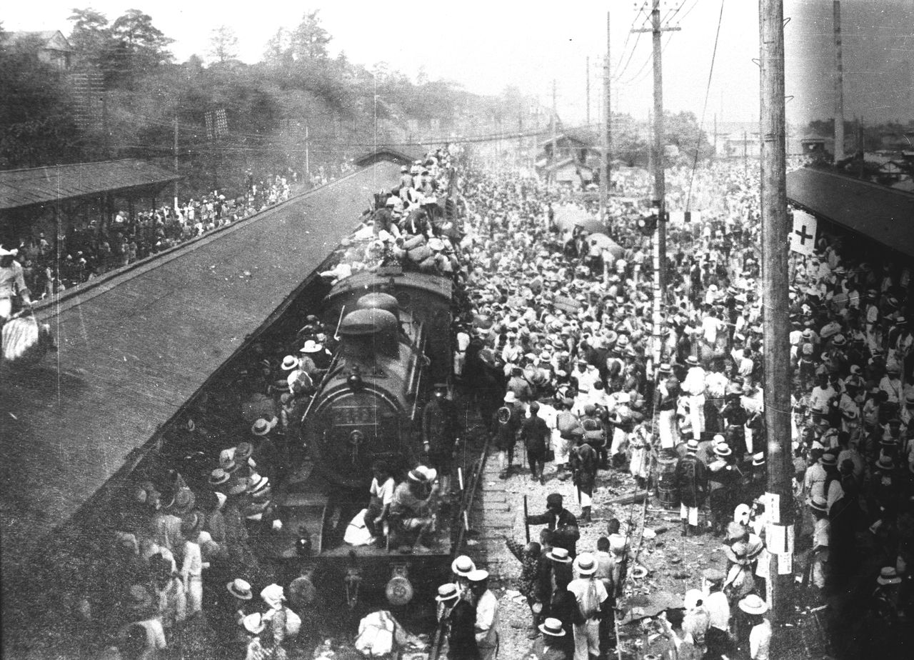 Со станции Ниппори отправляется поезд с людьми, которые эвакуируются после Великого землетрясения Канто (коллекция Железнодорожного музея)