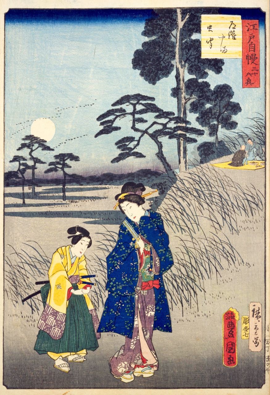 Гравюра «36 праздников, которыми гордится Эдо – слушание насекомых на горе Докан» (Эдо дзиман сандзюроккё докан яма муси кики). На ней изображена мать с сыном, которые пришли послушать стрекот насекомых (коллекция Национальной парламентской библиотеки)