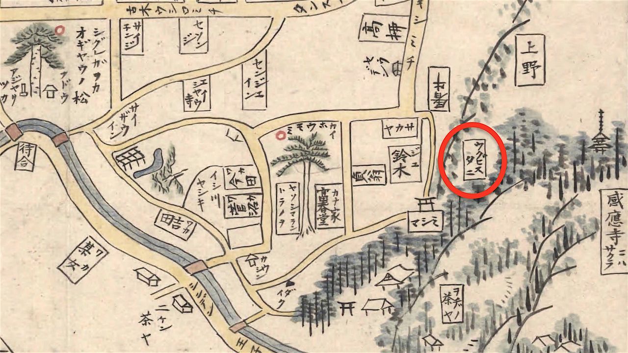 В «Справочных материалах по столице» (Гофунай бико) написано, что Угуисудани располагалась в Янака, в районе Накасака (предоставлено Токийским столичным архивом)