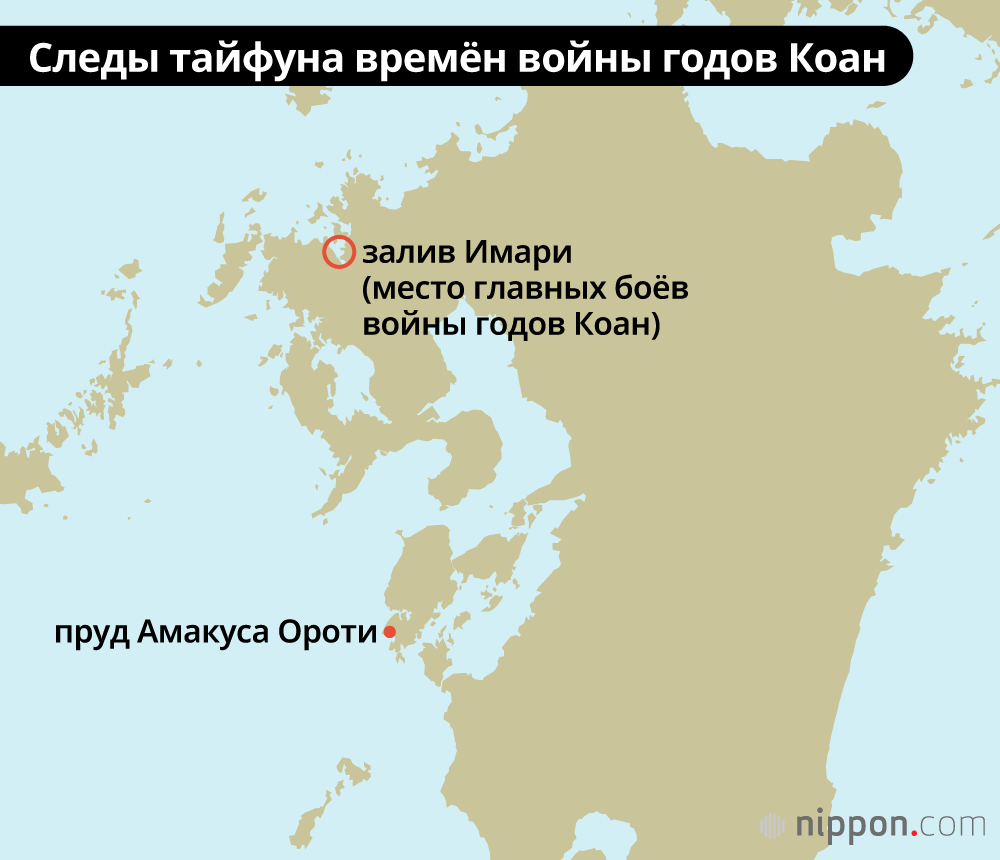 Таким образом, следы чрезвычайно мощного тайфуна были выявлены в пруду, расположенном примерно в 120 километрах к югу от залива Имари на северо-западе Кюсю, где на морском дне были обнаружены военные корабли Юань.