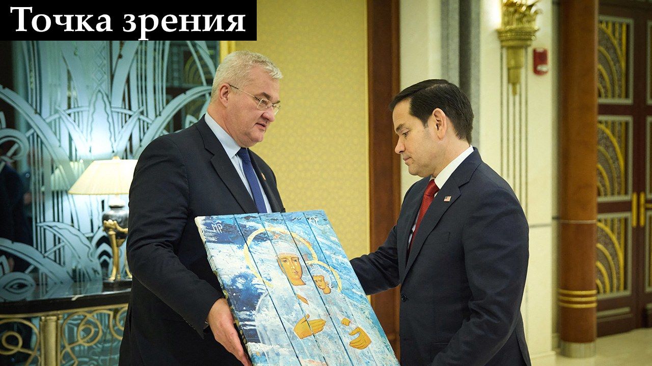 Фотография к заголовку: Министр иностранных дел Украины Андрей Сибига показывает государственному секретарю США Марко Рубио (справа) икону, выполненную на ящике из-под патронов, во время американо-украинских переговоров высокого уровня в Джидде на западе Саудовской Аравии, 11 марта 2025 г., снимок предоставлен администрацией президента Украины (© AFP/Jiji Press)