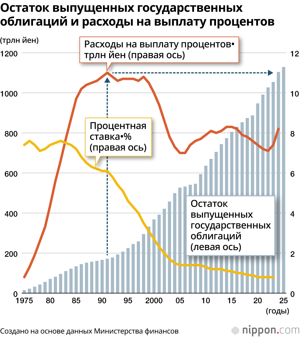 Остаток выпущенных государственных облигаций в том году составлял 172 трлн йен. В 2024 году он составил 1104 трлн йен, увеличившись в 6,4 раза. Однако расходы на обслуживание государственного долга в том же году составили всего 8,2 трлн йен, что меньше, чем в 1991 году, так как за это время доходность государственных облигаций при размещении (жёлтая линия) значительно снизилась.