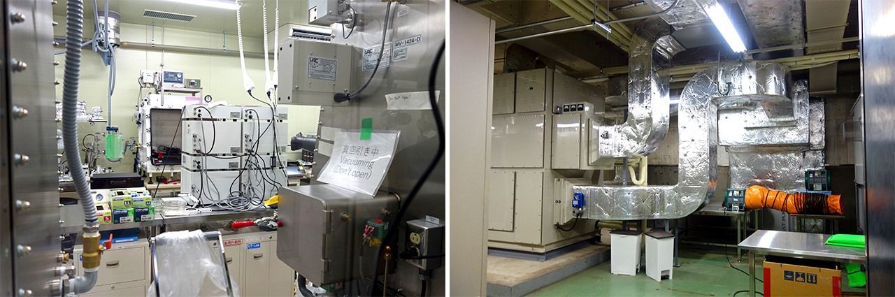 Слева: лаборатория Национального института передовых промышленных наук и технологий; справа: для того, чтобы поддерживать в лаборатории влажность на уровне не более 1%, в соседнем помещении пришлось установить крупный удалитель влаги (снимки сделаны автором статьи)