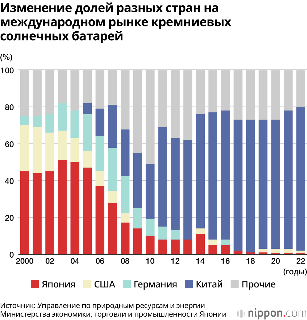 Даже если им удастся вкусить плоды первенства, в дальнейшем ожесточенного соперничества не избежать. Японии уже довелось испить чашу горького опыта в случае с кремниевыми солнечными батареями. До 2000-2007 годов она занимала на международном рынке первое место, а в какой-то момент ее доля достигала 50%. Но с 2008 года рынок заполонила дешевая китайская продукция, и сейчас по всему миру, в том числе и в Японии, в подавляющем большинстве продаются китайские изделия.