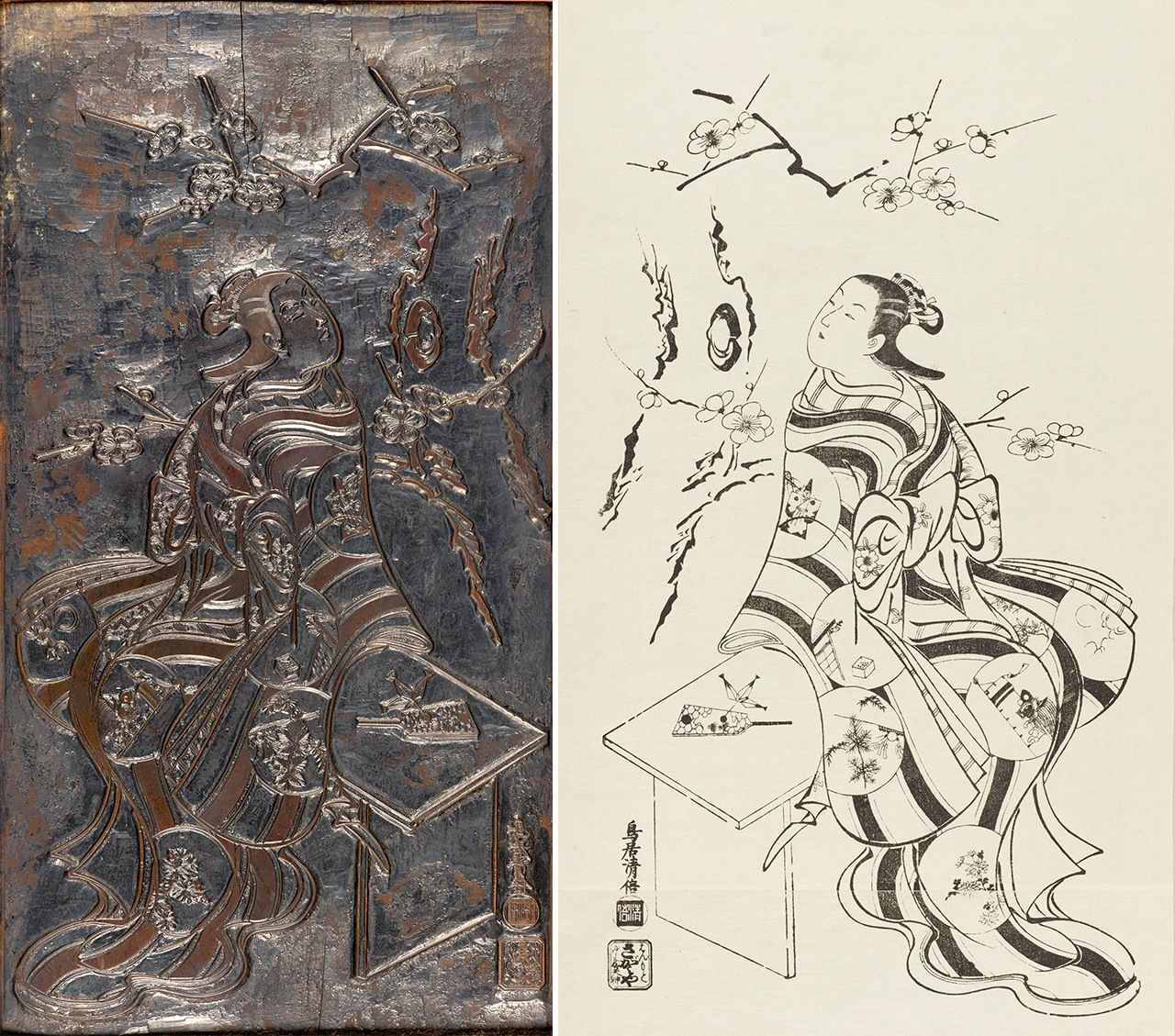 Гравюра укиё-э «Красавица под цветущей сливой» и ценная печатная доска, сохранившаяся до наших дней. В данном случае на доске вырезана только картинка, текста нет (источник: ColBase)