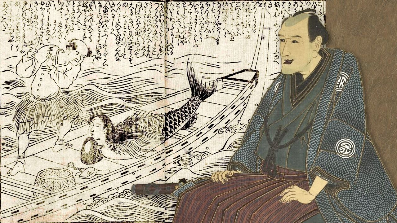 Изображения к заголовку: Сцена из книги «Девушка в коробке – русалка из магазина масок», в которой рыбак вытаскивает русалку из моря (собрание специальных коллекций Центральной столичной библиотеки Токио) и портретом Санто Кёдэна (ColBase)