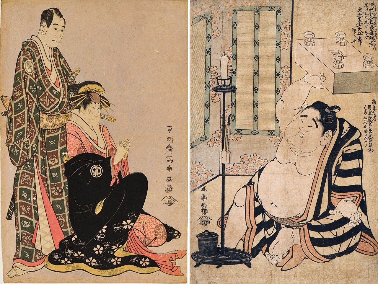 Слева – «Савамура Содзюро III в роли Нагоя Сандза и Сэгава Кикунодзё III в роли красавицы Кацураги». Справа – гравюра «Дайдодзан Бунгоро поднимает доску для игры в го» изображает популярного борца сумо, это более поздняя работа Сяраку (источник изображений: ColBase)
