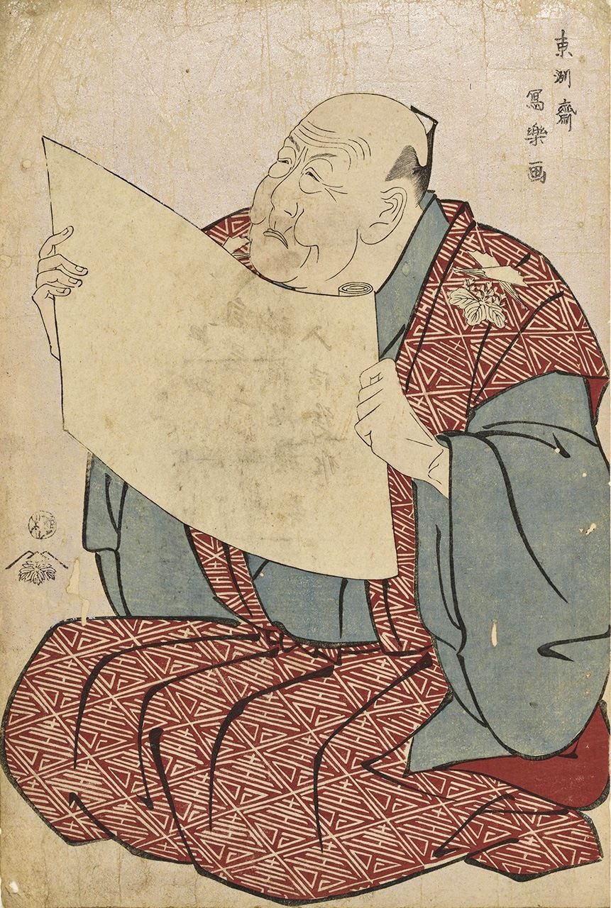 «Синодзука Ураэмон зачитывает данные пьесы» (Синодзука ураэмон миякодза кодзё дзу, рекламное объявление Цутая Дзюдзабуро о выходе второй серии портретов авторства Сяраку) 6 года Кансэй (1794). Судзуки Тосио отмечает, что изображение пальцев на этой картине отличается от «особых пальцев-гусениц Сяраку», напоминая стиль Утамаро (источник: ColBase)