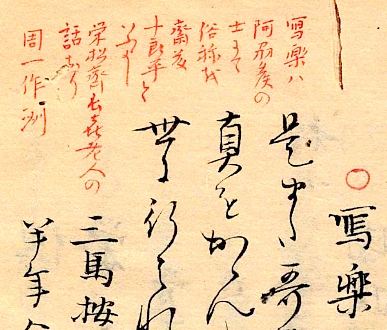 - 15-й год Тэмпо (1844) «(Сяраку) – человек, родившийся в годы Тэммэй-Кансэй (1781-1801). Обычное имя – Сайто Дзюробэй. Он жил в Хаттёбори в Эдо и был актёром театра Но у правителей княжества в земле Ава» (историк и писатель Сайто Гэссин). Здесь «правители княжества в земле Ава» – это род Хатисука, правителей княжества Токусима на Сикоку.