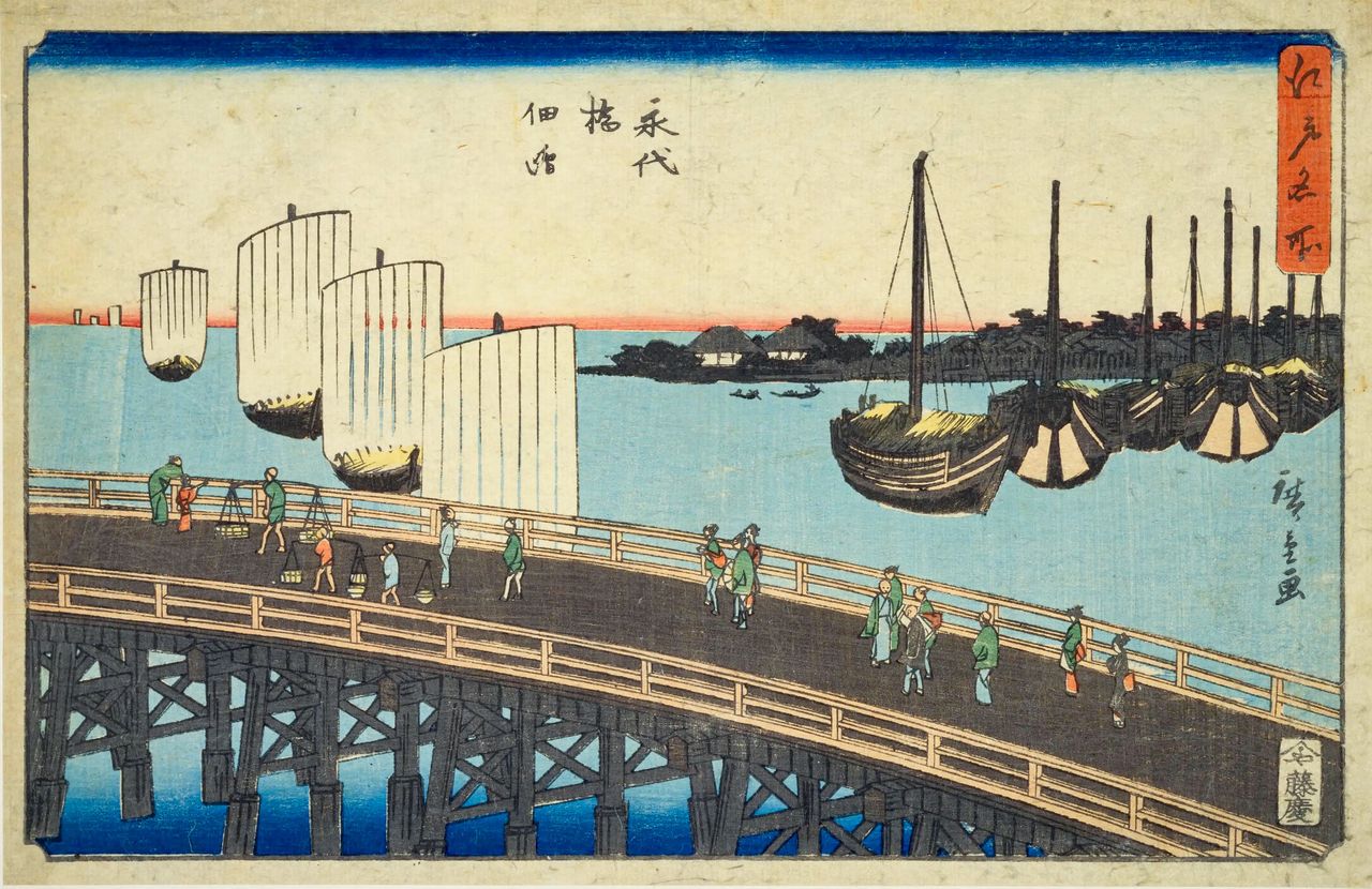 Утагава Хиросигэ, «Знаменитые места Эдо», мост Эйтай на остров Цукуда (предоставлено Национальной парламентской библиотекой)