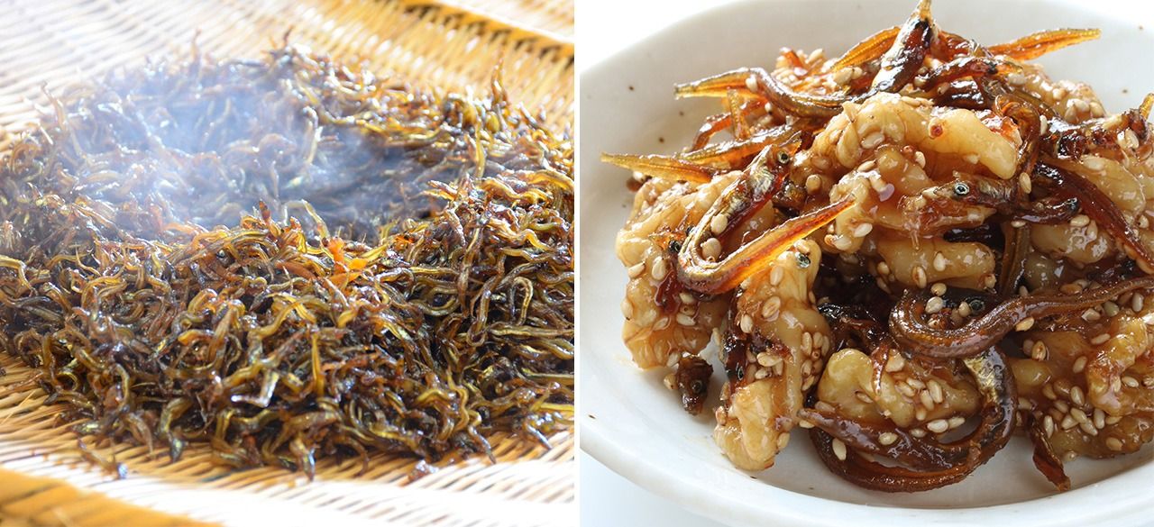 Слева – кугини из песчанки из префектуры Хёго (предоставлено Министерством сельского хозяйства, лесного хозяйства и рыболовства в рамках проекта «Наша местная кухня»); справа – коунаго куруми, цукудани с коунаго и грецким орехом (PIXTA)