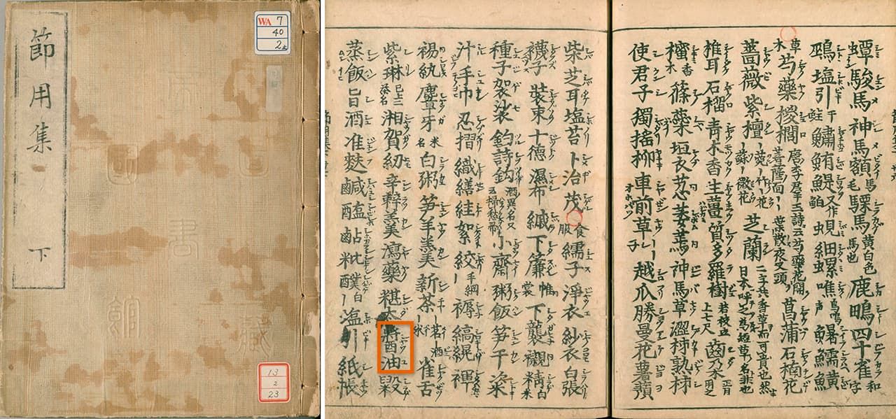 Слева – обложка второго тома словаря «Сэцуёсю» издания 1597 года; справа – слово «соевый соус» (醤油) (из собрания Национальной парламентской библиотеки)