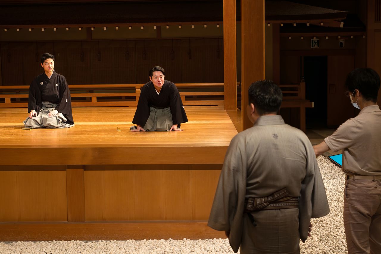 Перед выступлением Таканосукэ (справа) и Сакон (слева) получили наставления от отца Сакона Оноэ Сёроку IV (© Мацуда Тадао; предоставлено офисом Такая)