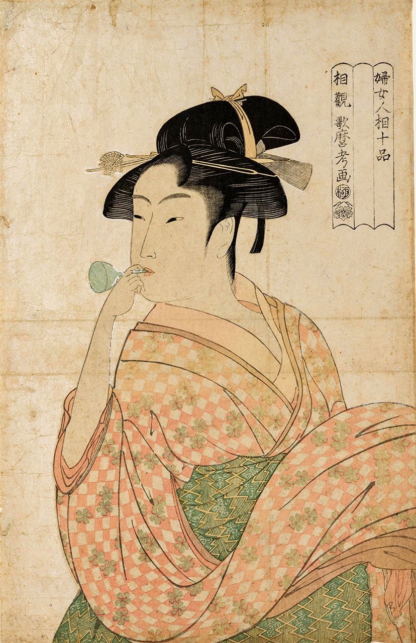 «Женщина, дующая в поппин (стеклянная игрушка, издающая звук)» из серии «Десять типов женского характера» (Фудзин нинсо дзюппон). Примерно 4-5 гг. Кансэй (1792-1793) (ColBase)