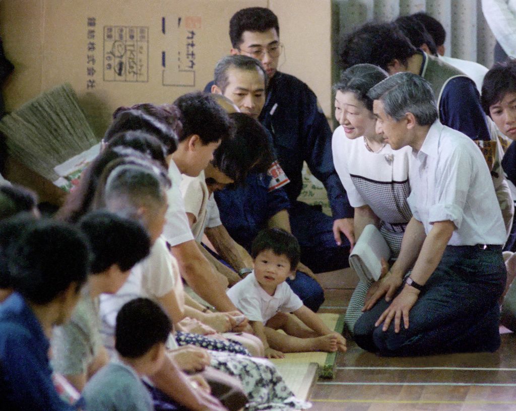Ныне почетные император и императрица (а в то время императорская чета) беседуют с эвакуированными при посещении района бедствия, вызванного извержением вулкана Ундзэн-Фугэндакэ), 10 июля 1991 г., город Симабара, префектура Нагасаки (© «Киодо имиджиз»)