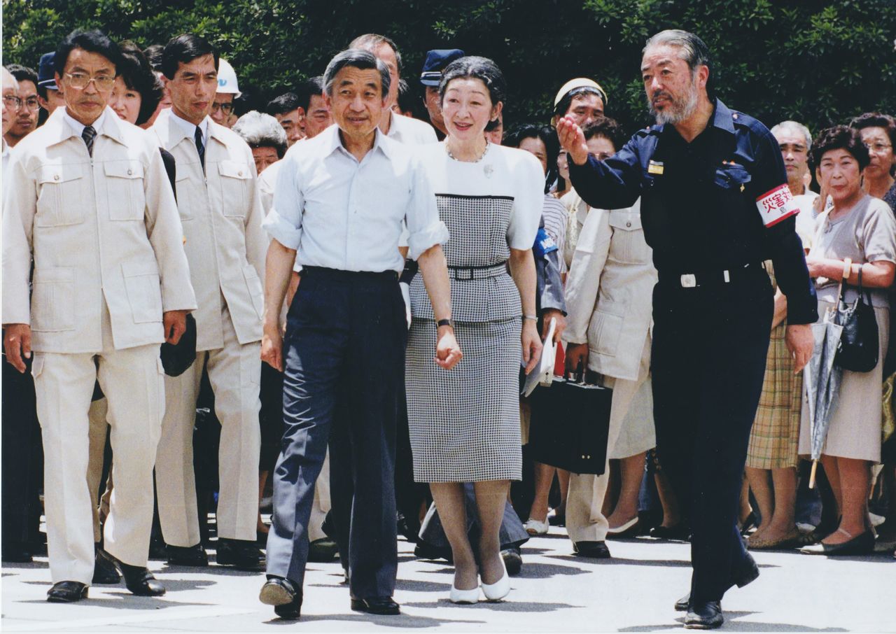 Первым районом бедствия, которую император Акихито посетил после восшествия на престол, стала префектура Нагасаки, пострадавшая от вулканического извержения Ундзэн-Фугэндаке в июле 1991 года. Император в белой рубашке с закатанными рукавами выслушал рассказ о ситуации мэра города Симабара, после чего опустился на колени, чтобы побеседовать с эвакуированными.