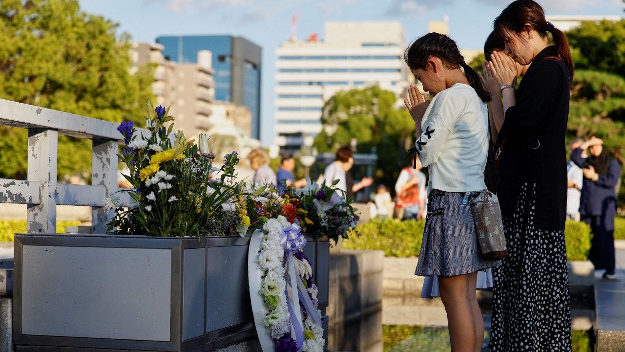 Фотография к заголовку: Люди в безмолвной молитве перед памятником-кенотафом со списками погибших от атомной бомбардировки (© Reuters)