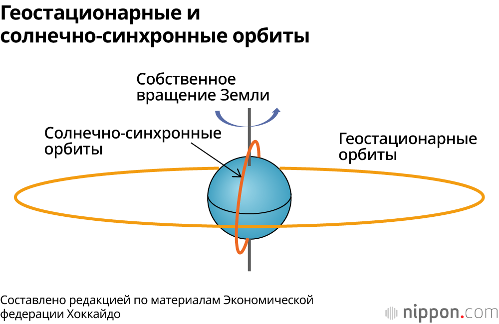 (*1) ^ Поскольку спутник, вращающийся на солнечно-синхронной орбите (SSO) вокруг Земли с севера на юг, проходит над определенным участком планеты ежедневно в одно и то же время, это дает удобную возможность наблюдений из определенной точки за изменениями, происходящими на земле. Геостационарная орбита – траектория, по которой спутник обращается над Землей по линии экватора, позволяет направлять на Землю электромагнитные волны со стабильной позиции, как, к примеру, при спутниковом вещании.