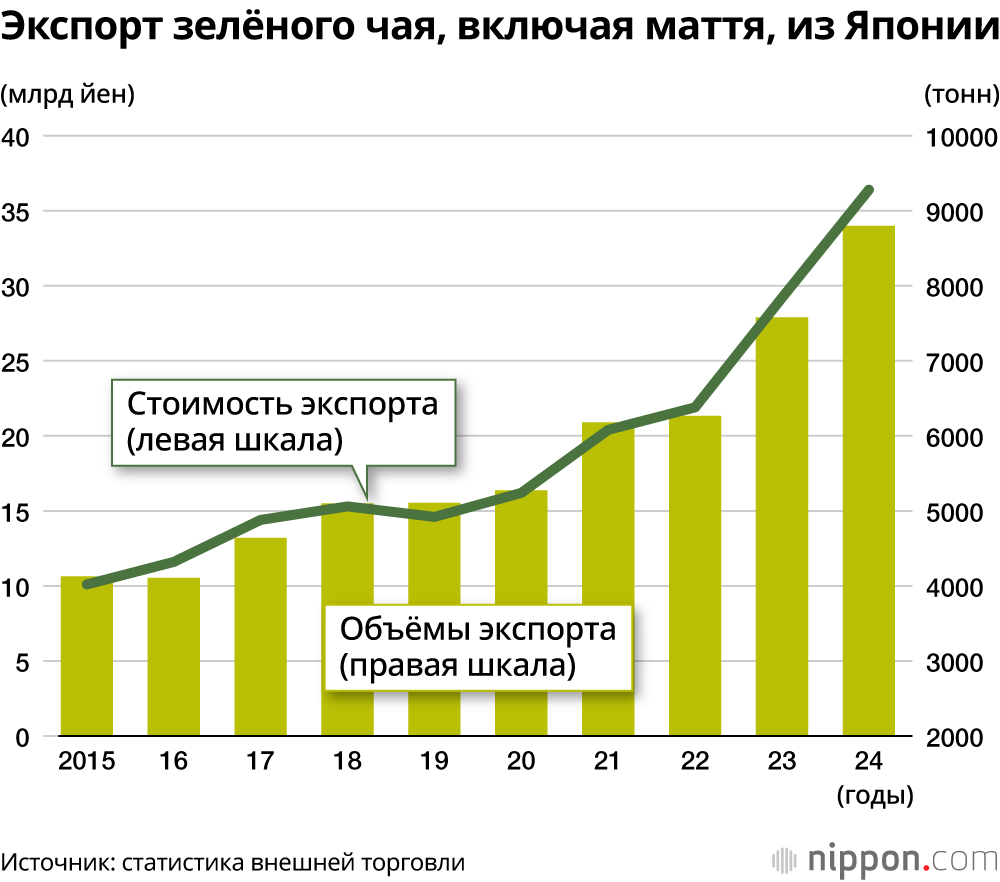 Параллельно с ростом популярности маття за рубежом продолжают расти как объёмы, так и стоимость экспорта японского зелёного чая, включая маття. Согласно торговой статистике, экспорт в 2024 году составил приблизительно 8798 тонн, что на 16,1% (1219 тонн) больше, чем в предыдущем году, и в 2,5 раза больше, чем 10 лет назад. Стоимость экспорта, также подверженная влиянию ослабления йены, достигнет 36,4 млрд йен, что на 24,7% (7,2 млрд йен) больше, чем в предыдущем году. Стоимость экспорта за период с января по август 2025 составила 38 млрд йен, превысив показатели прошлого года.