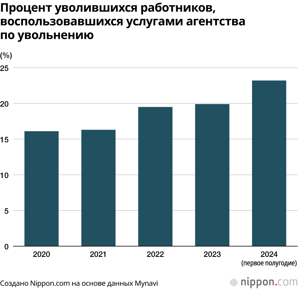 Согласно отчету, опубликованному в октябре 2024 года платформой по поиску работы Mynavi, среди 800 опрошенных (допускалось несколько вариантов ответа) основной причиной обращения в такие агентства стало то, что руководство «пыталось или попыталось бы помешать увольнению» (40,7%). Вторым по популярности ответом стал вариант «Я находился в такой атмосфере, где невозможно было открыто сказать о желании уволиться» (32,4%). Именно эта причина чаще всего встречалась в интервью, которые автор проводил лично.