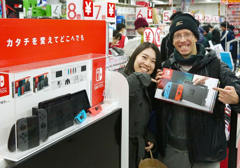 Покупатели в магазине электротоваров Bic Camera на Икэбукуро в Токио, радуются покупке новой игровой системы Nintendo Switch 3 марта 2017 г. Последний раз компания представляла новую систему в 2012 году, это была Wii U. Новая система может использоваться как домашняя консоль, её также можно носить с собой (Jiji Press)