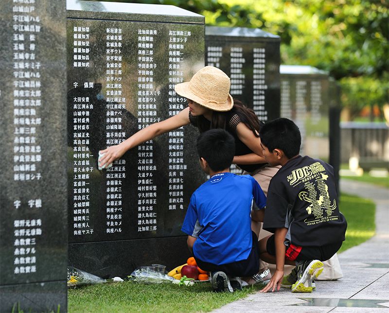 Семья отдаёт дань уважения родственнику, погибшему во время Битвы за Окинаву у Краеугольного камня мира в Мемориальном парке мира, Итоман, преф. Окинава, 23 июня 2017 г. Каждый год жители префектуры вспоминают день окончания битвы, происходившей в 1945 году и унёсшей жизни более чем 240 000 человек. Город Итоман пережил особенно тяжёлые бои в завершающий период битвы (© Jiji)