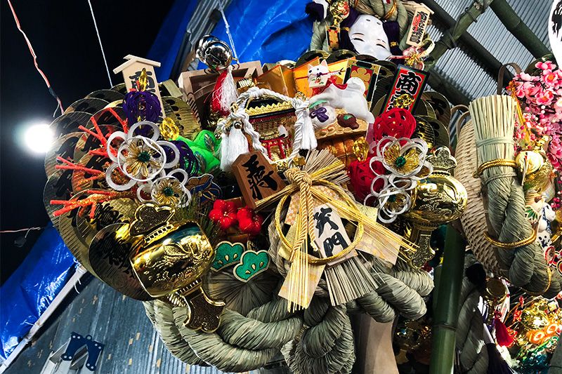 Вход на рынок Ториноити в святилище Ханадзоно в Синдзюку, Токио. Рынок известен тем, что в новогодний период здесь продаются «счастливые» грабли-кумадэ, которыми «сгребают удачу».