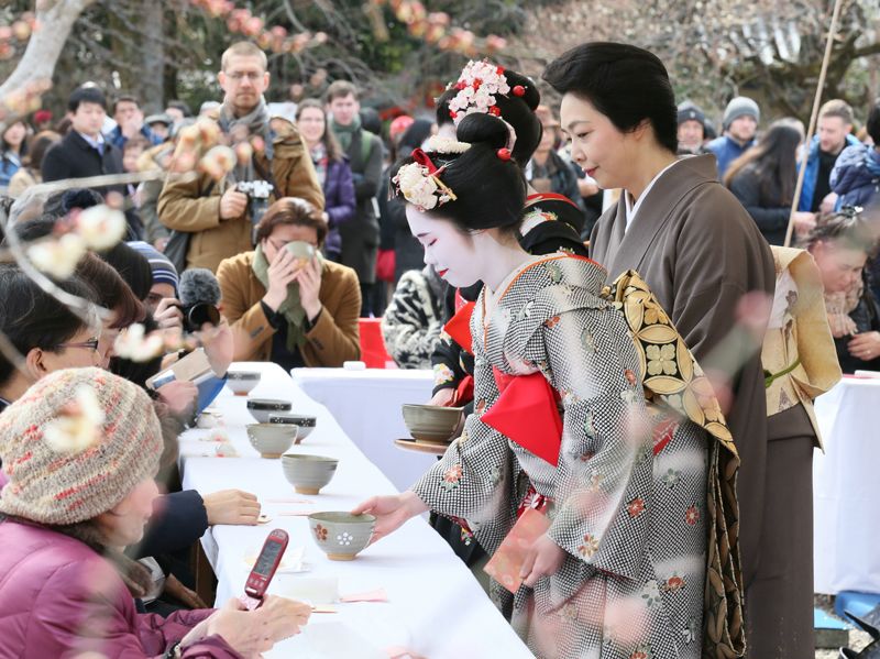 Майко подаёт чай во время открытой для публики церемонии в святилище Китано Тэммангу в Киото. Праздник цветения сливы проводится здесь каждый год 25 февраля, в день смерти учёного Сугавара-но Митидзанэ, жившего в IX веке – его почитают в этом святилище в качестве божества. (© Jiji)