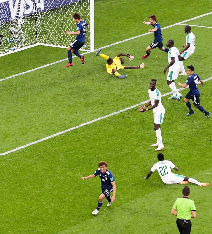 Инуи Такаси забивает первый гол сборной Японии в первом тайме матча с Сенегалом. 24 июня, Екатеринбург, Россия (© Jiji)