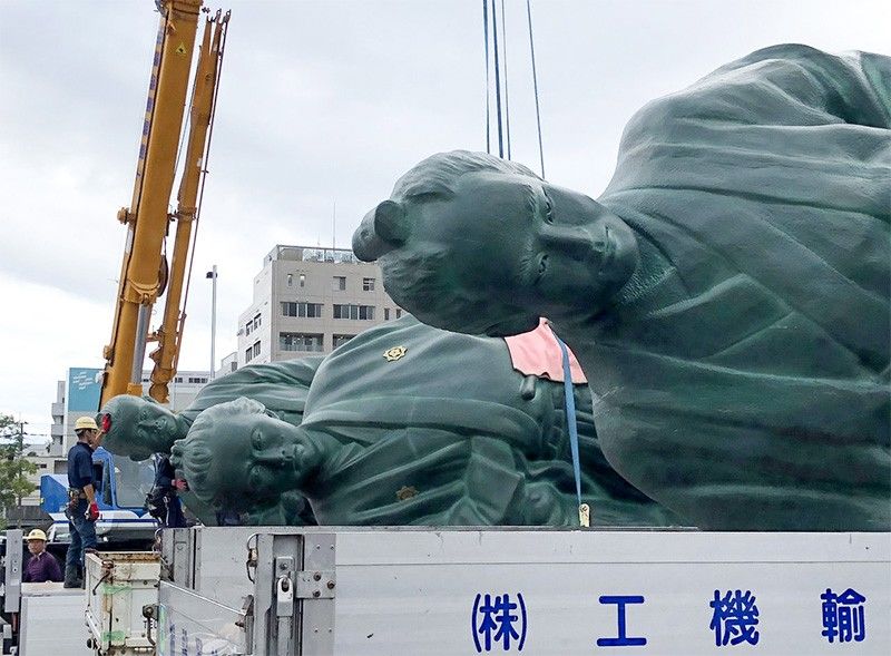 [Фото] В японском городе Коти временно демонтируют памятники из-за тайфуна