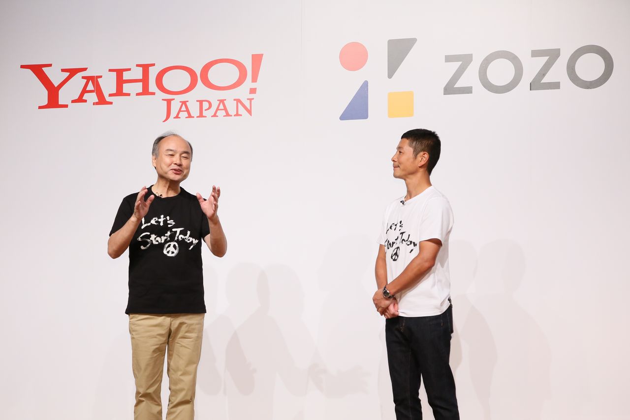Председатель правления и президент Softbank Group Сон Масаёси (слева), приглашенный на пресс-конференцию Yahoo о приобретении Zozo. Справа - основатель Zozo Маэдзава Юсаку, 12 сентября 2019 г. Токио, столичный район Мэгуро (фотография предоставлена Jiji Press)