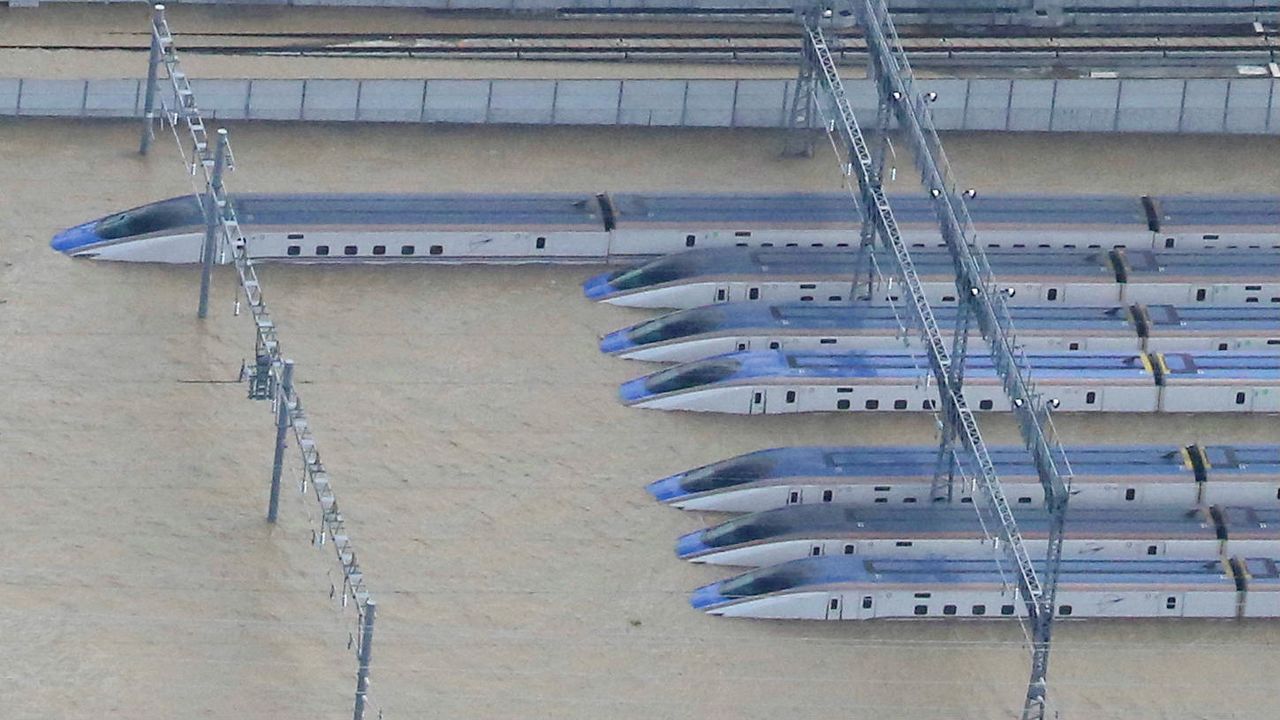 Затопленные поезда синкансэн линии Хокурику после тайфуна Хагибис (Jiji)