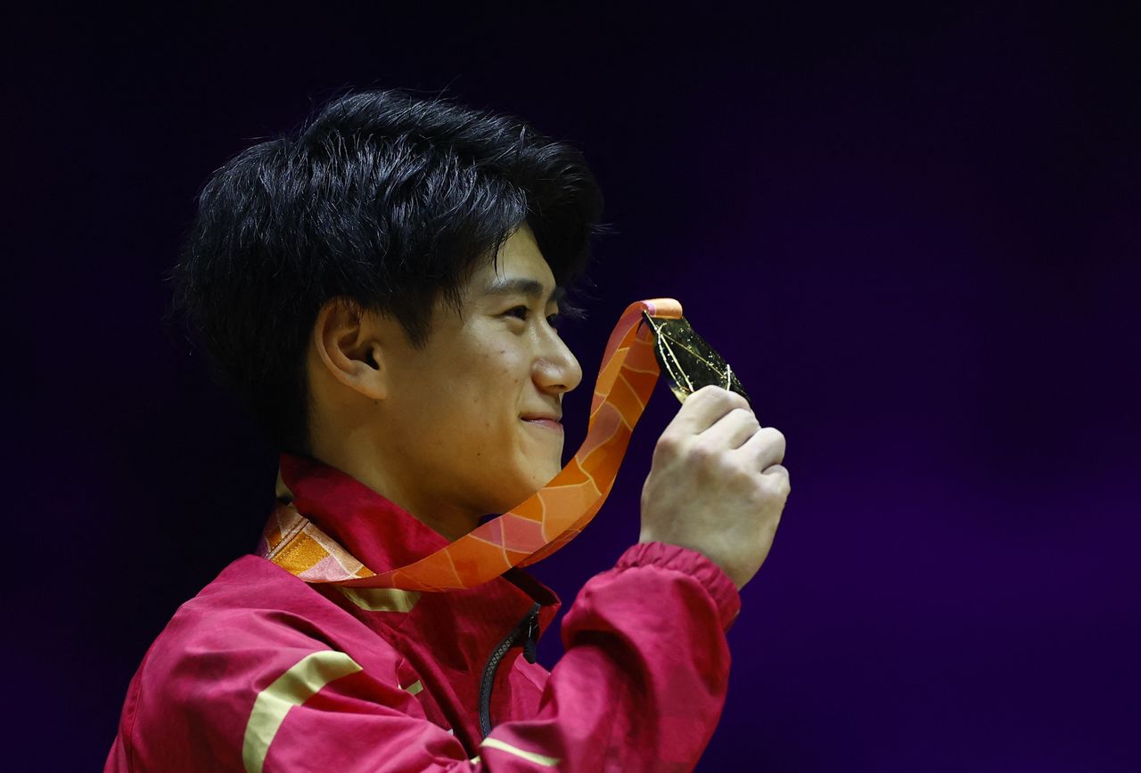 Гимнаст Хасимото Тору с золотой медалью Чемпионата мира за свою первую победу в этих состязаниях в индивидуальном мужском многоборье, 4 ноября 2022 г., Великобритания, Ливерпуль (© Reuters)