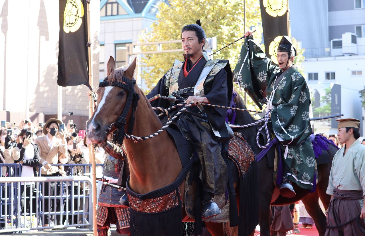 Выступивший в роли Оды Нобунаги на костюмированной конной процессии актер Кимура Такуя (слева) и Ито Хидэаки, 6 ноября 2022 г., город Гифу (© Jiji Press)