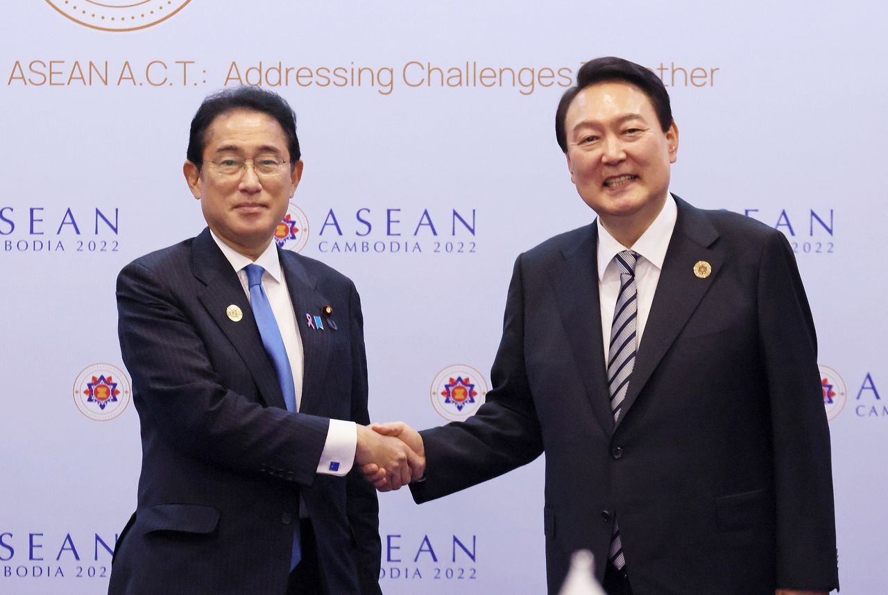 Премьер-министр Японии Кисида Фумио провел в Камбодже переговоры с президентом Южной Кореи Юн Сок Ёлем. Стороны договорились стремиться к скорейшему решению вопроса о принудительном труде в военное время. Официальная встреча японского и южнокорейского лидеров состоялась впервые приблизительно за 3 года. В ходе трехстороннего саммита Японии, США и Южной Кореи с участием американского президента Джо Байдена стороны договорились, принимая во внимание усиление гегемонистских действий Китая, работать вместе на пути к инклюзивному, устойчивому и безопасному свободному и открытому Индо-Тихоокеанскому региону.