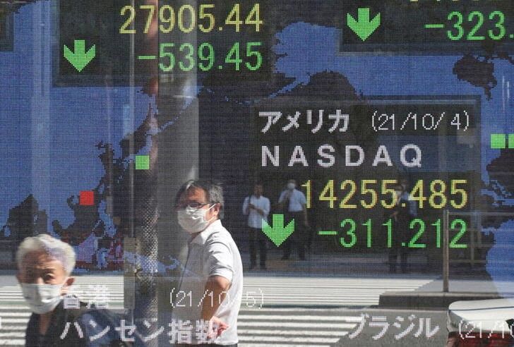 People wearing protective masks amid the coronavirus disease (COVID-19) outbreak are reflected on an electronic board displaying Japan's Nikkei and U.S. Nasdaq index outside a brokerage in Tokyo, Japan, October 5, 2021. REUTERS/Kim Kyung-Hoon