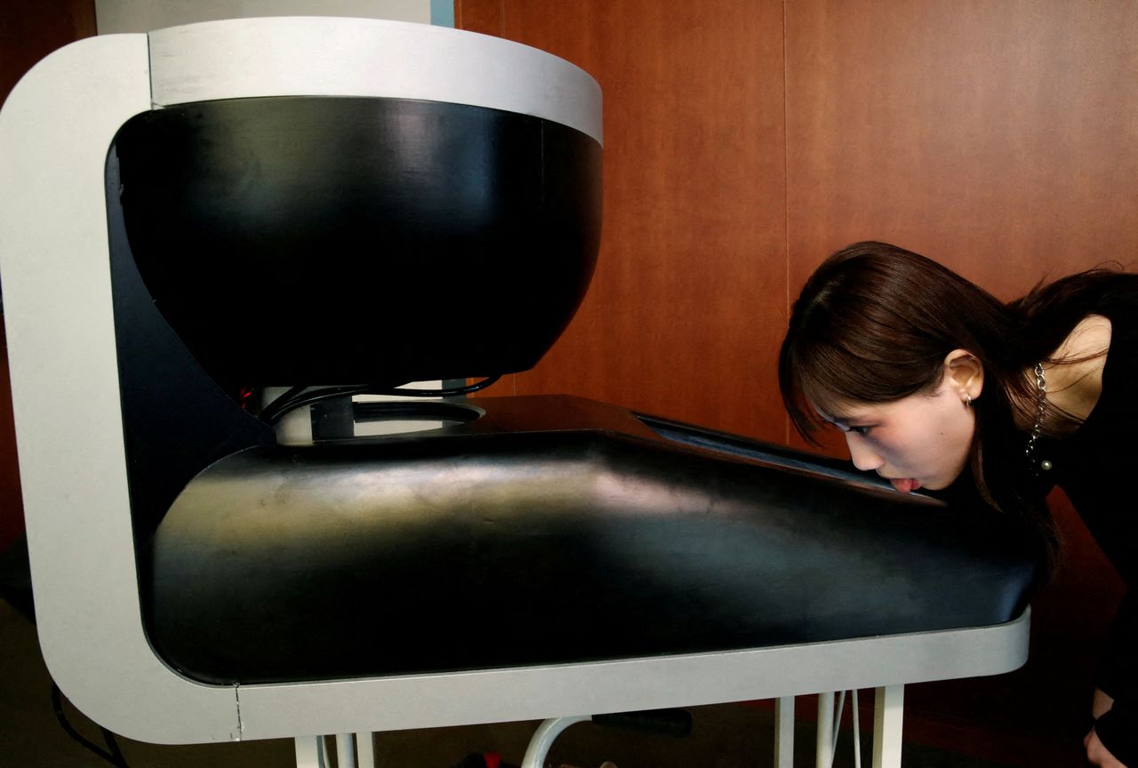 Студентка Университета Мэйдзи Хоу Юки облизывает экран Taste the TV (TTTV), прототипа телеэкрана, который может имитировать вкус различных продуктов, во время его демонстрации в университете в Токио, Япония, 22 декабря 2021 г. REUTERS / Kim Kyung-Hoon