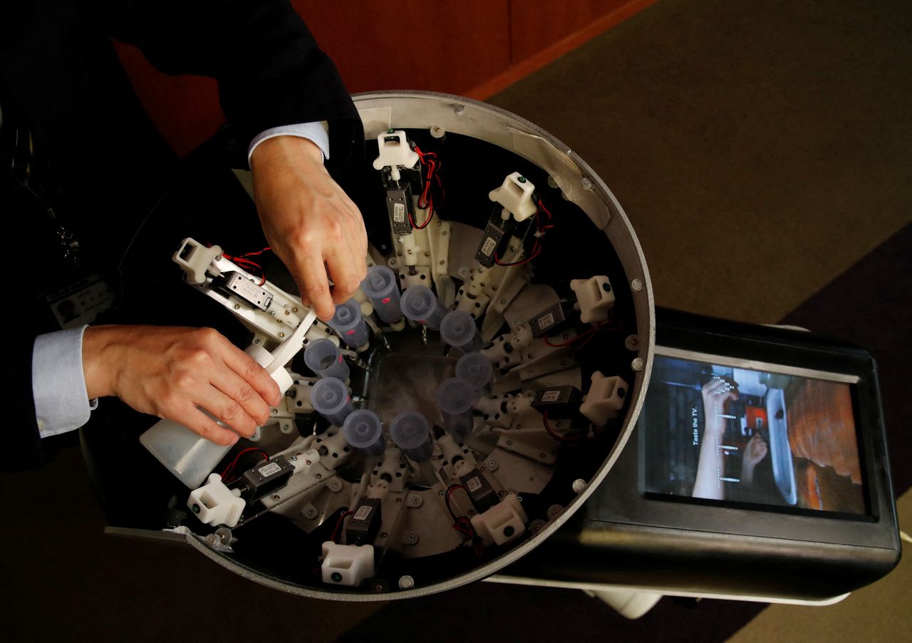 Профессор Университета Мэйдзи Миясита Хомэй наполняет ёмкости со вкусовыми добавками, демонстрируя Taste the TV (TTTV), прототип телеэкрана, который может имитировать вкус различных продуктов, в университете в Токио, Япония, 22 декабря 2021 г. REUTERS / Kim Kyung- Hoon