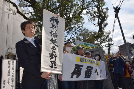 Члены группы адвокатов с флагом «Особые судебные процессы – осуждены!» после вынесения судебного решения по иску против государства по вопросу требования проведения повторного суда по «делу Кикути». Вторая половина дня 26 февраля, город Кумамото