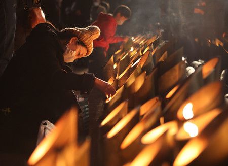 В парке в районе Тюо люди зажгли бамбуковые фонари и вознесли безмолвные молитвы в 5:46 утра, время, когда 17 января 1995 года в регионе произошло землетрясение магнитудой 7,3.