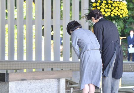 После того, как государственный министр здравоохранения, труда и социального обеспечения Кога Ацуси поместил останки в склеп, наследный принц и наследная принцесса поклонились перед ним. Представители семей погибших преподнесли цветы.