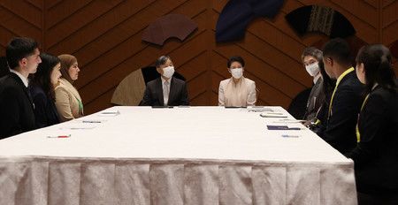 Император Нарухито и императрица Масако провели переговоры с молодёжью из четырёх стран и японской молодёжью, отправленной в эти страны.