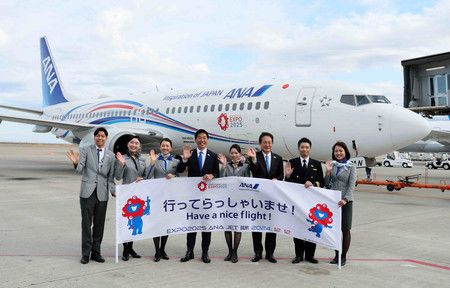Его белый фюзеляж окрашен плавными линиями в фирменные цвета выставки и ANA, а также нарисован официальный логотип выставки.